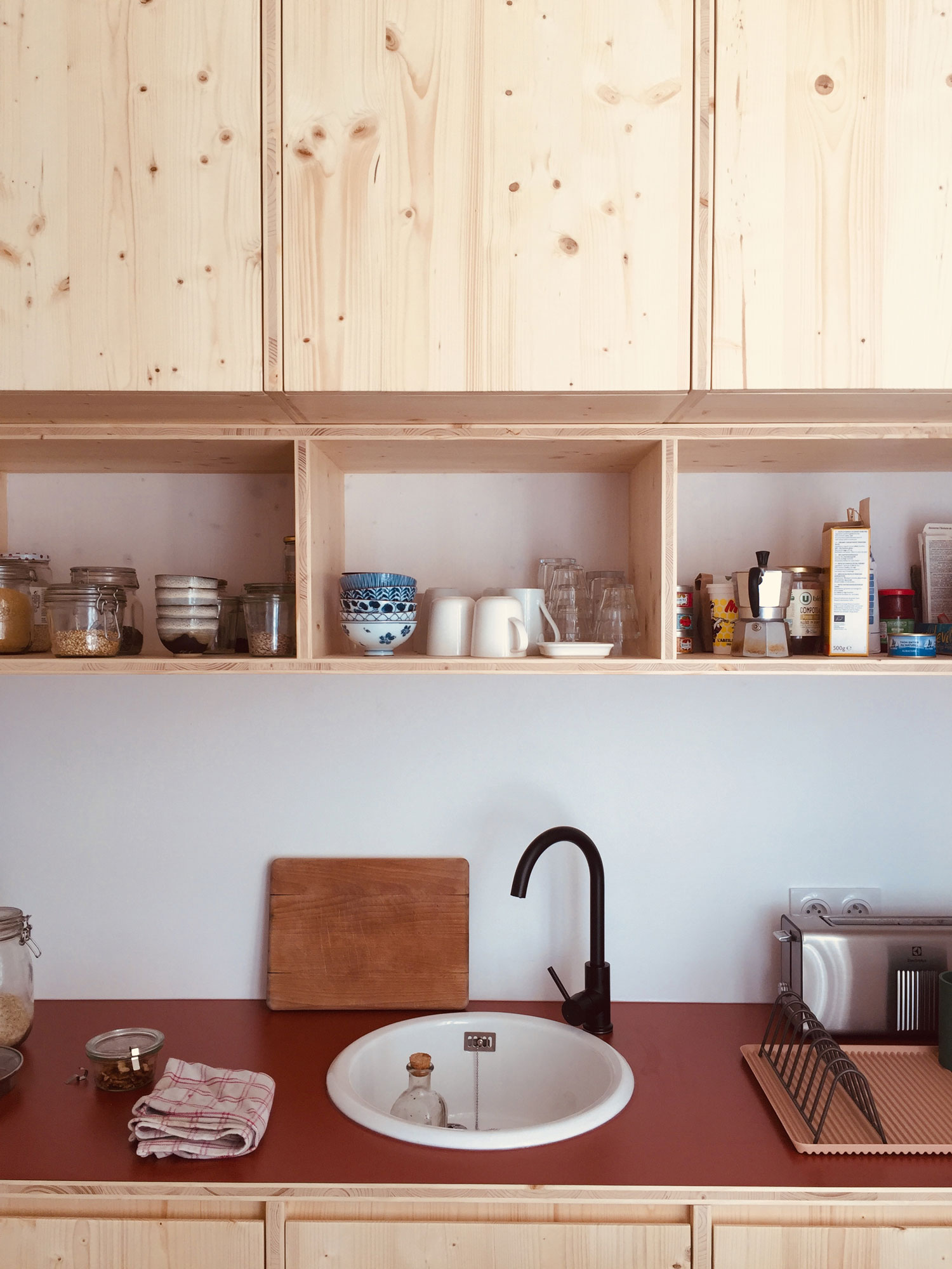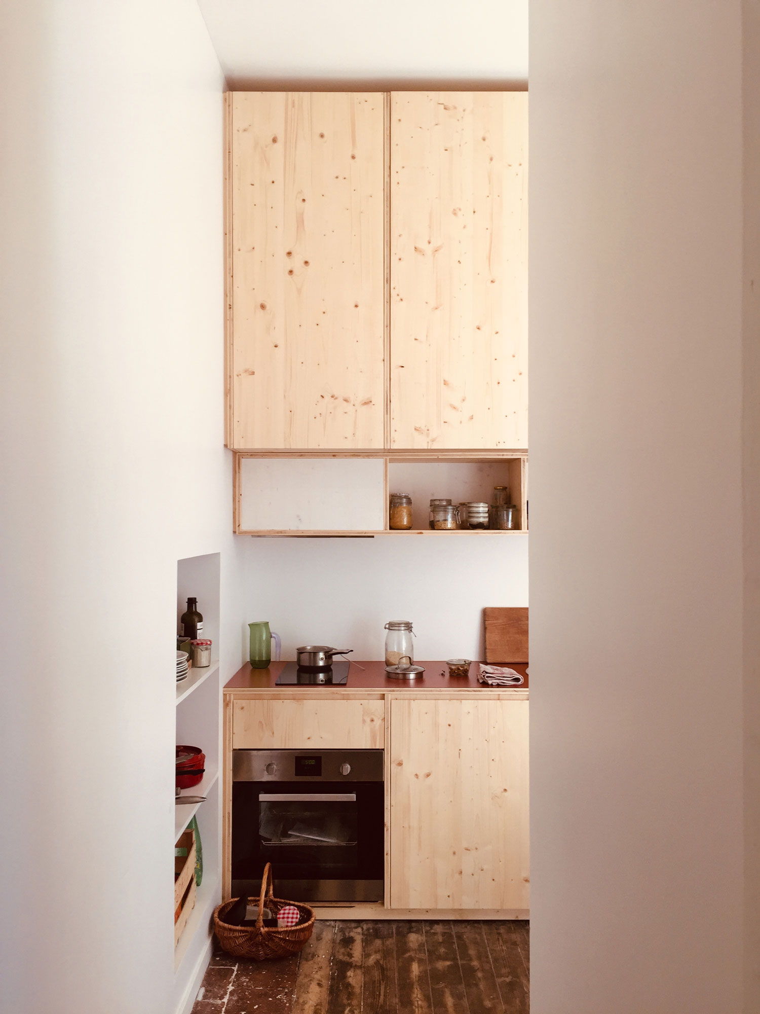 Situé dans un appartement ancien, ce meuble de cuisine est conçu pour une pièce de petite surface mais de très grande hauteur. Ses dimensions hors normes dégagent de nombreux rangements et permettent un gain de place dans cet appartement de 52m². Les éléments électroménagers sont dissimulés dans le bas du meuble afin de ne pas encombrer visuellement l’appartement de ces équipements techniques. Pour créer un décor chaleureux et vivant, un soin particulier est apporté au détail de mise en œuvre du bois : les tranches de bois laissées apparentes ornementent les façades du meuble, l’étagère haute met en avant la vaisselle chinée, les livres et raconte les autres usages qui se déroulent dans une cuisine. Un bois produit localement a été choisi pour l’ensemble : épicéa portes et caissons. Finition huilée, huile éco-label.