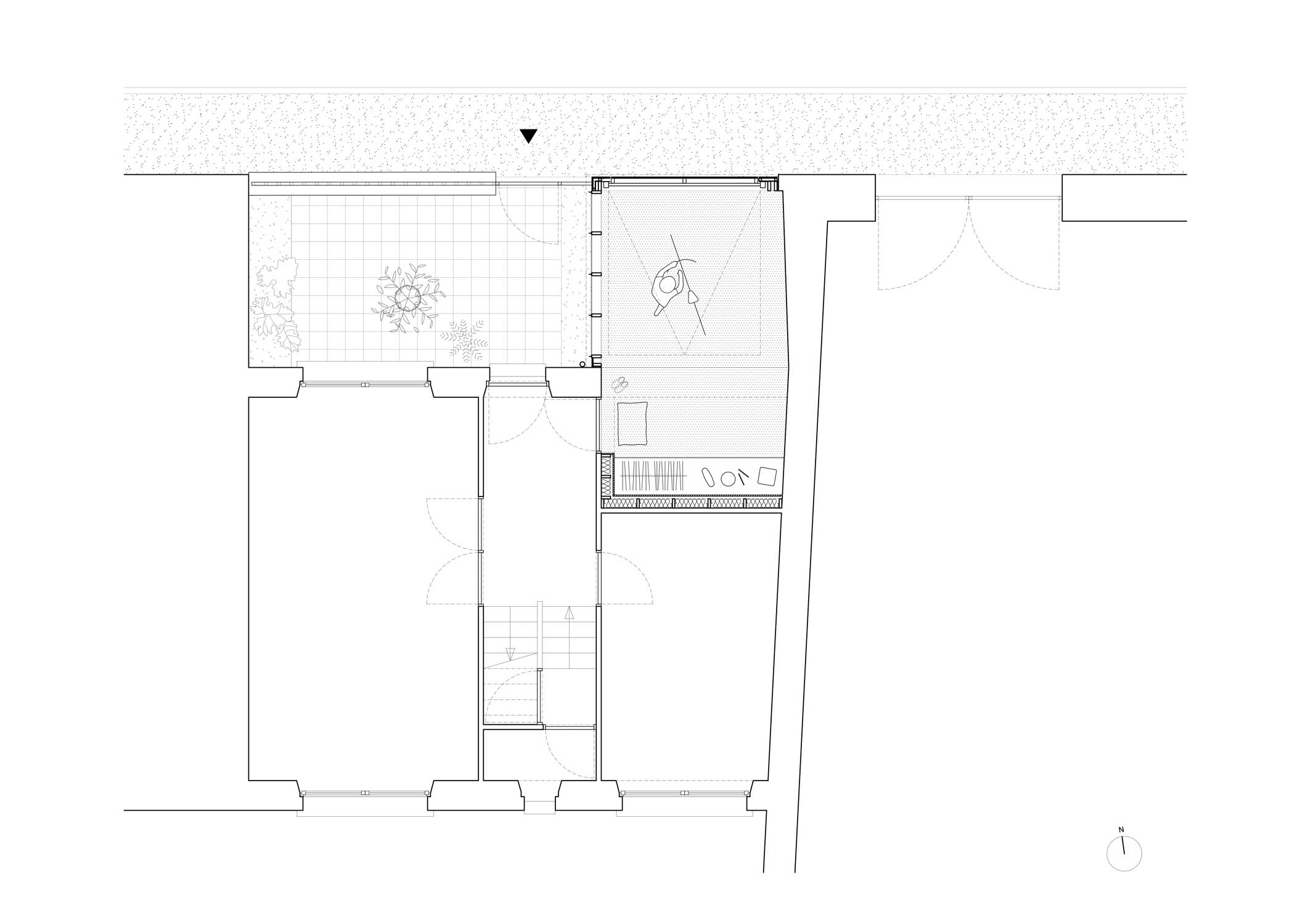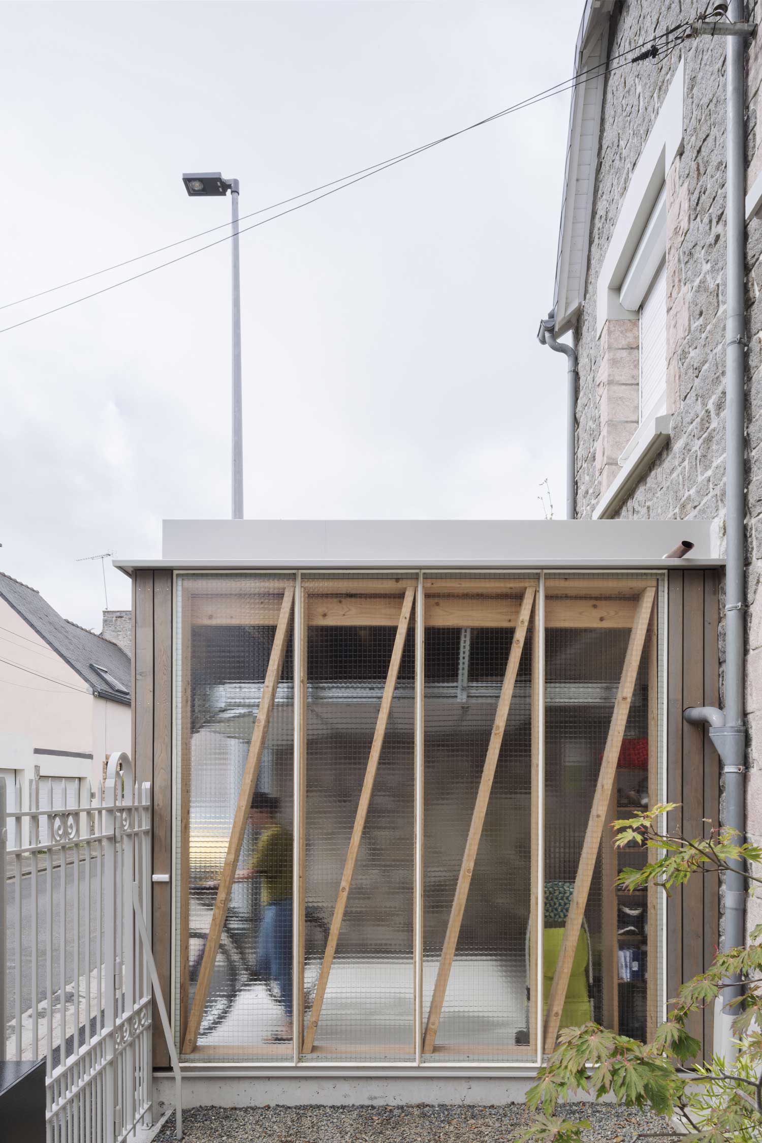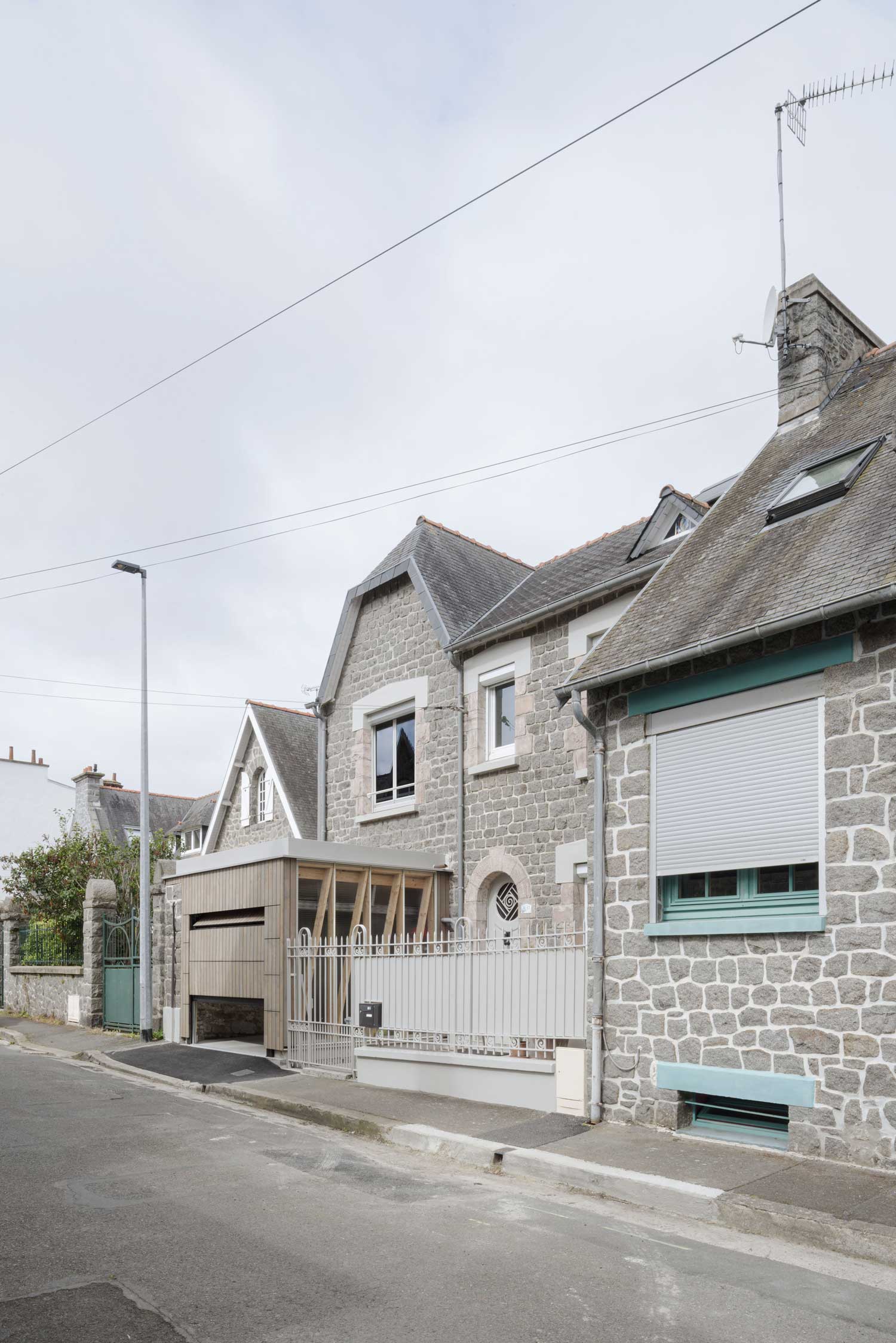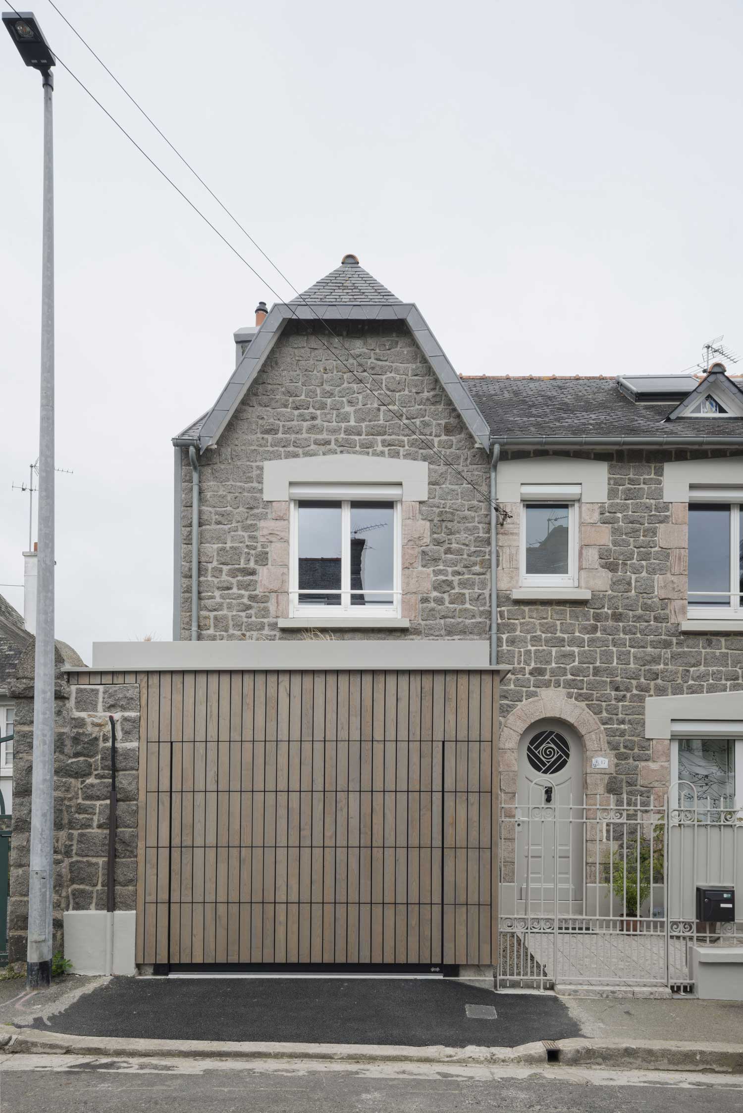 Accolé à une maison des années 1930, classée « bâtiment d’intérêt patrimonial », le garage d’origine présentait des désordres structurels nécessitant sa démolition et le dévoiement des réseaux (gaz, eau et électricité). Le nouveau garage est un projet contemporain qui exprime son mode constructif en ossature bois. Il s’insère dans un site exigu, entre des éléments de patrimoine classés et une limite sur rue. L’ensemble du projet est conçu de manière à préserver la qualité du tissu urbain. La nouvelle volumétrie est similaire à celle d’origine afin de conserver le rythme bâti. Des attentions rappellent les modénatures d’époque : une toiture végétalisée succède aux « jardinières-acrotères » et le détail de corniche est maintenu pour garder une toiture en retrait. Façade pleine côté rue, la porte de garage est dissimulée derrière un bardage châtaignier. Façade vitrée côté courette, l’apport de lumière naturelle facilite l’usage du garage en atelier.