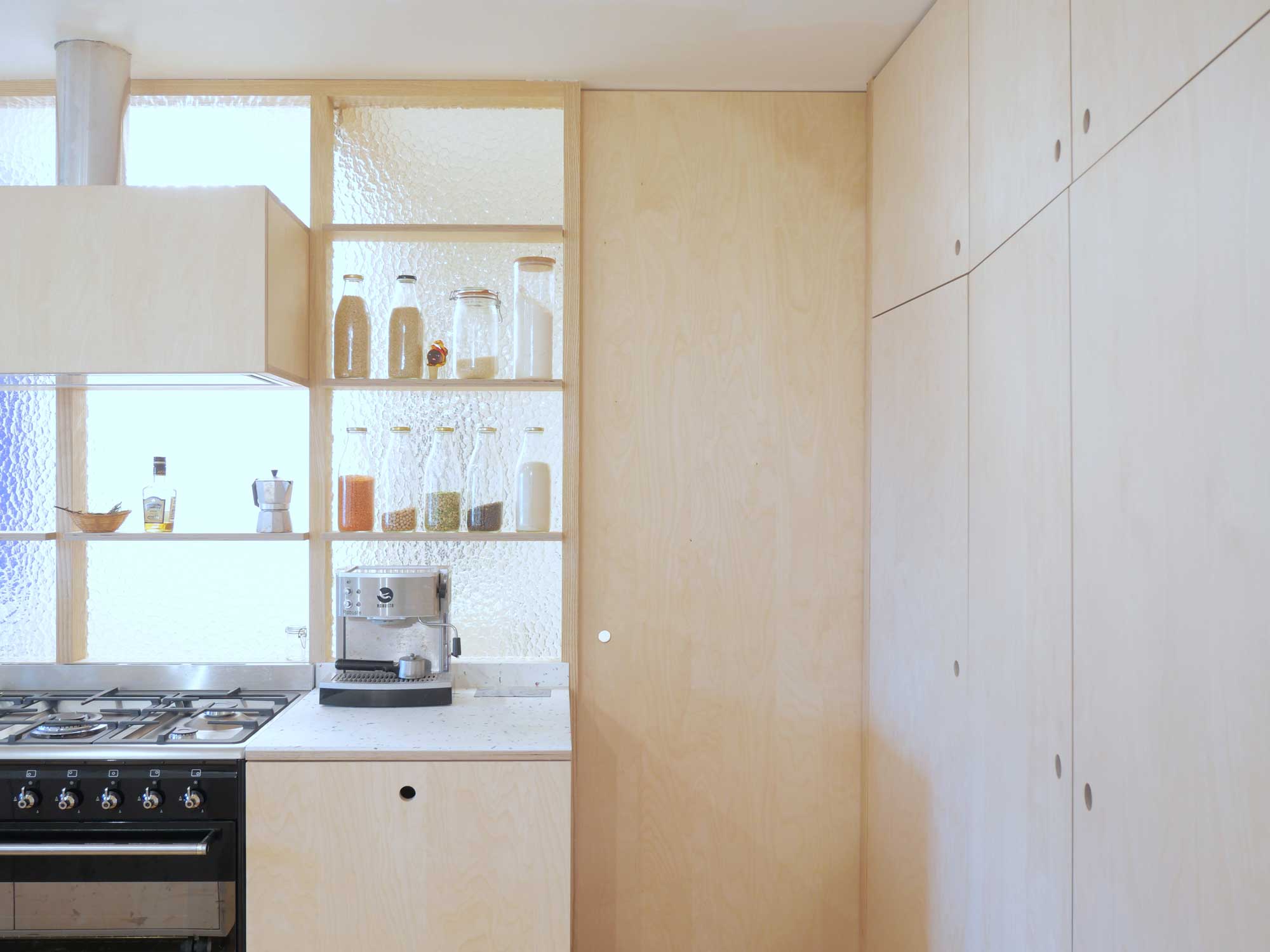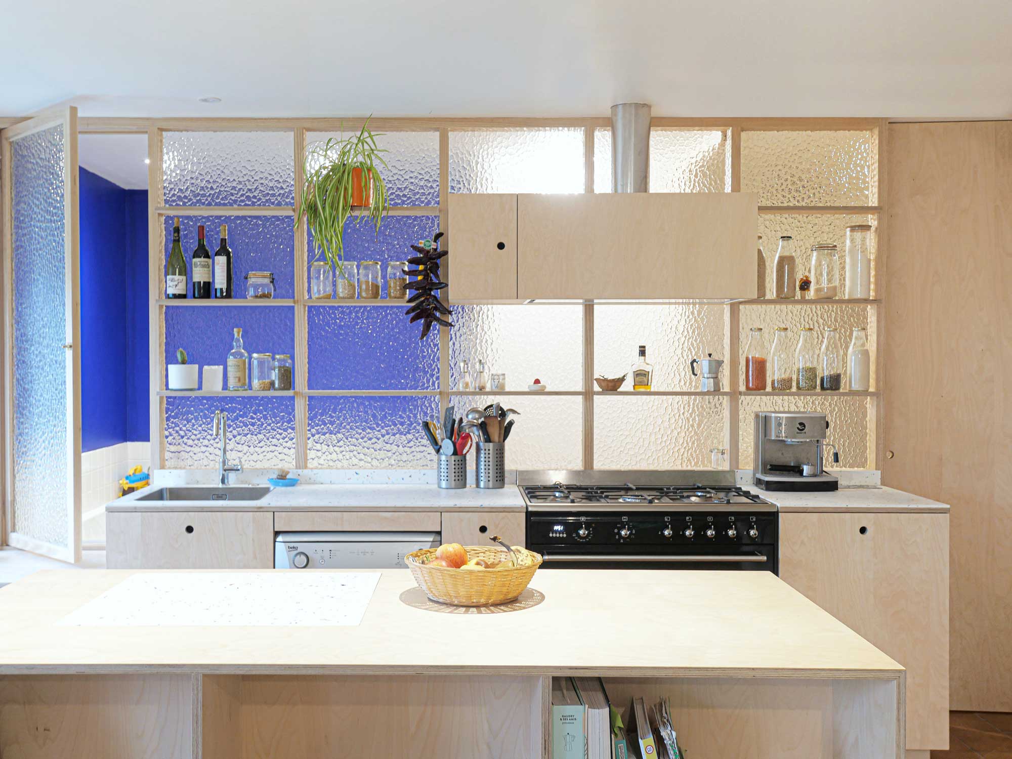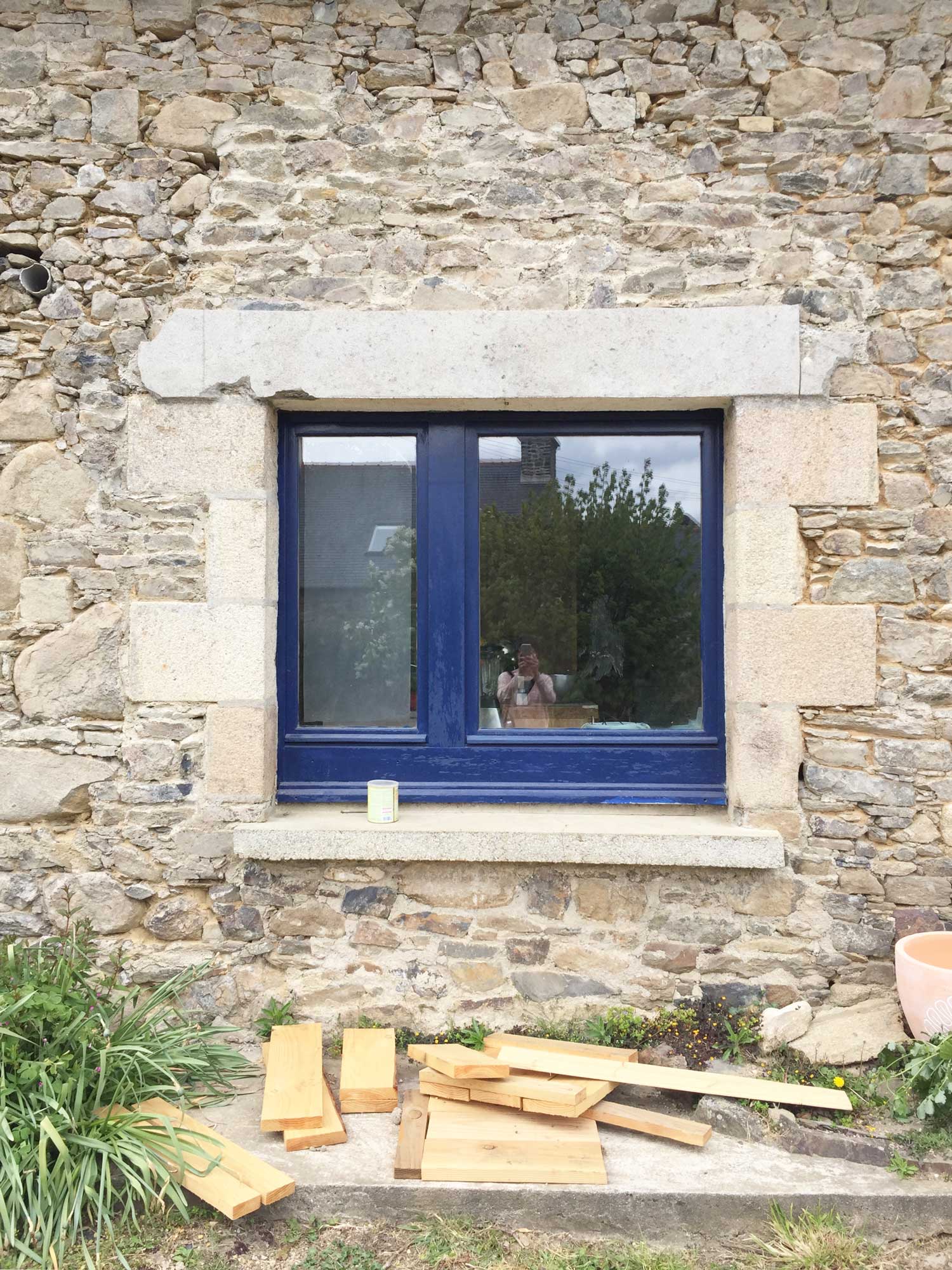 Située dans un hameau en campagne, la longère en pierre est idéalement exposée au Sud avec vue sur le jardin. Le projet d’agencement intérieur concerne le rez-de-chaussée uniquement. Les habitants de la maison souhaitaient agrandir leur cuisine pour bénéficier davantage d’espaces de rangement, tout en conservant des pièces techniques au rez-de-chaussée – salle-de-bain, sanitaires et buanderie. Un aménagement sur-mesure, avec une « cloison-verrière » a permis d’agrandir l’espace cuisine et de conserver la luminosité des pièces techniques.