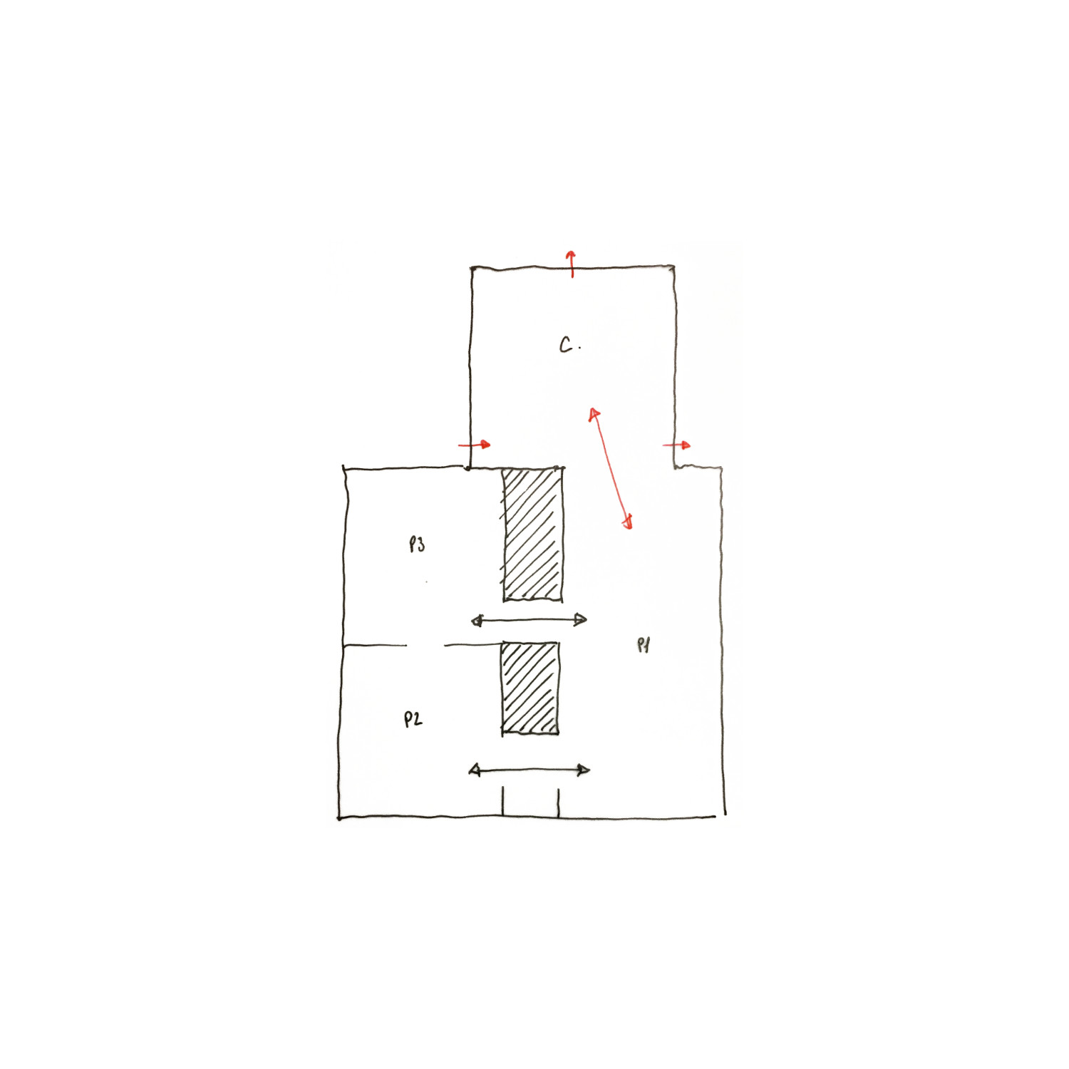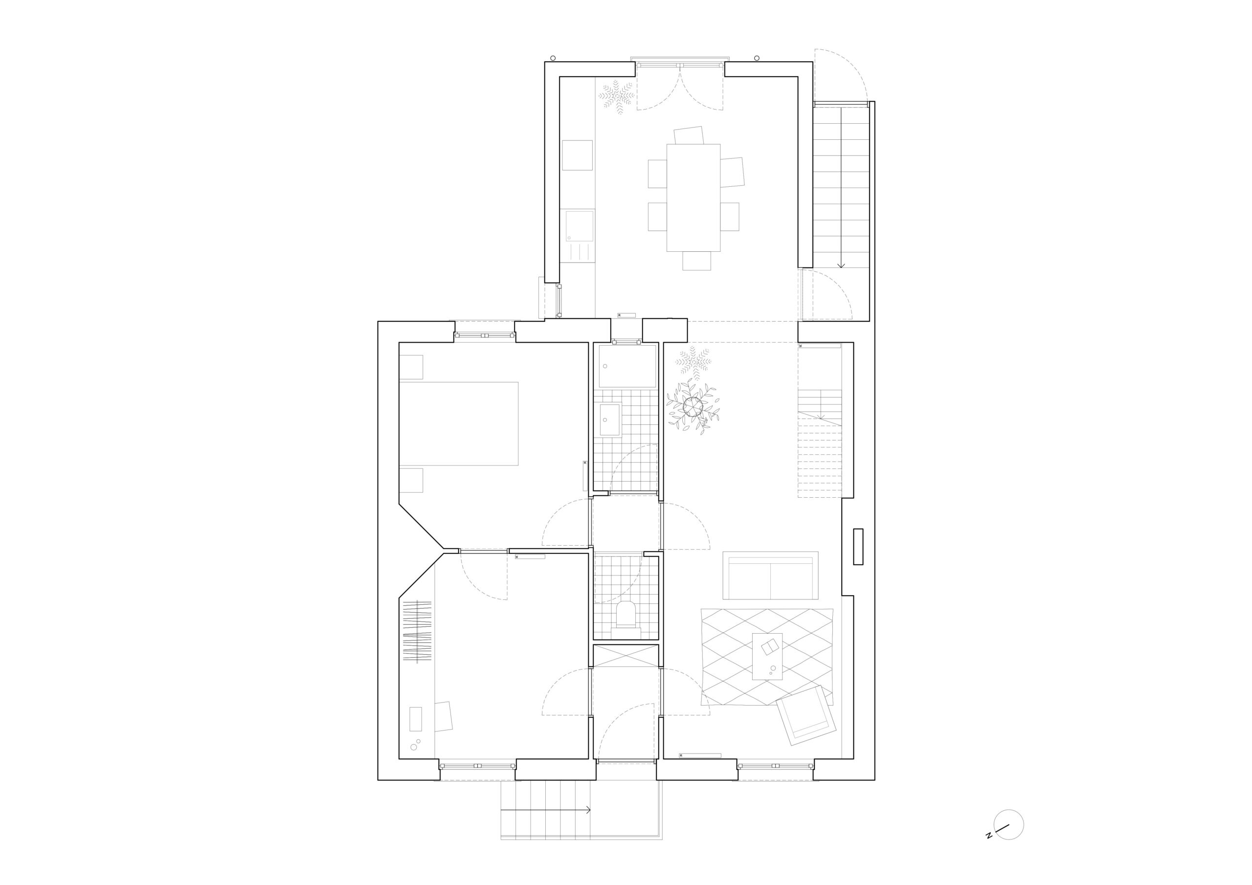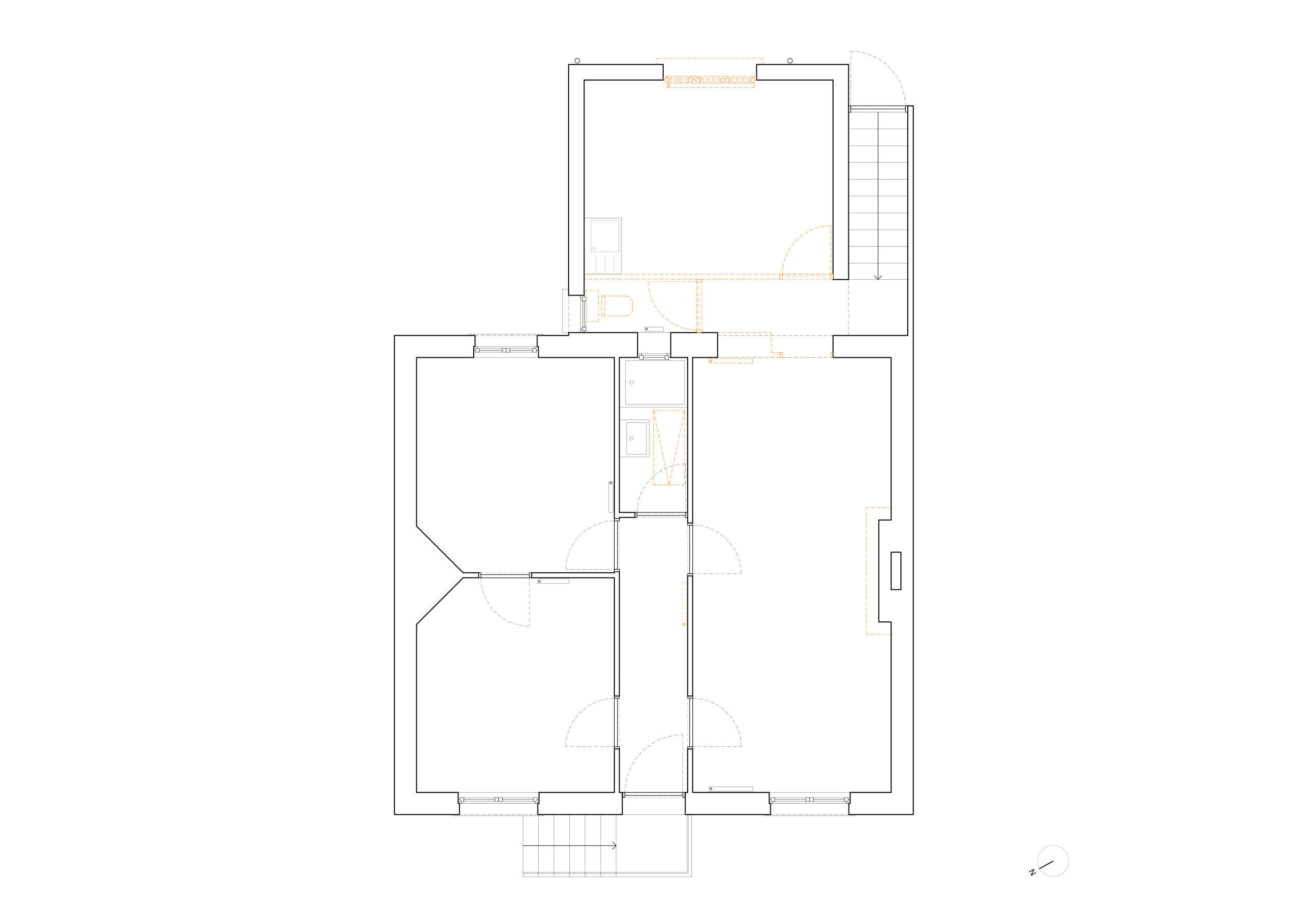 La maître d’ouvrage souhaite profiter des travaux d’amélioration thermique pour repenser la distribution du niveau principal, et profiter davantage d’une exposition traversante Est-Ouest dans les pièces de vie. Dans le cadre de notre accompagnement en phase diagnostic et études préalables, nous avons ciblé des interventions minimales permettant de répondre à ses attentes. Le sanitaire a été déplacé au profit d’une cuisine plus spacieuse et de la création d’une entrée ; une ouverture tout hauteur est venue remplacer la baie côté jardin.