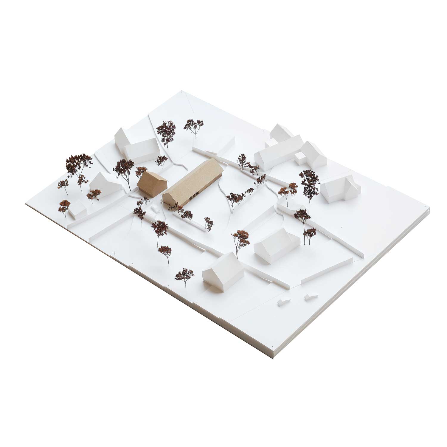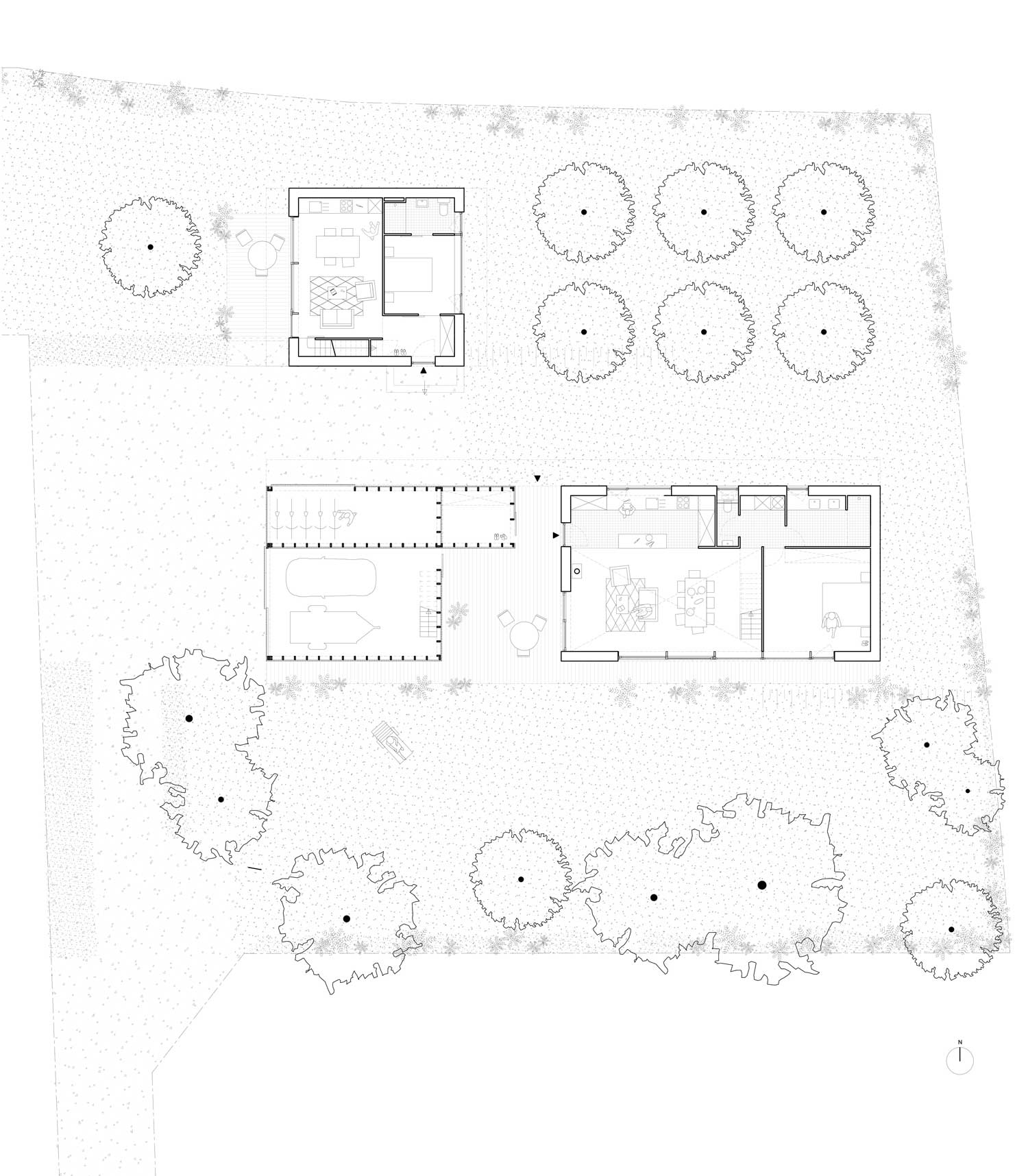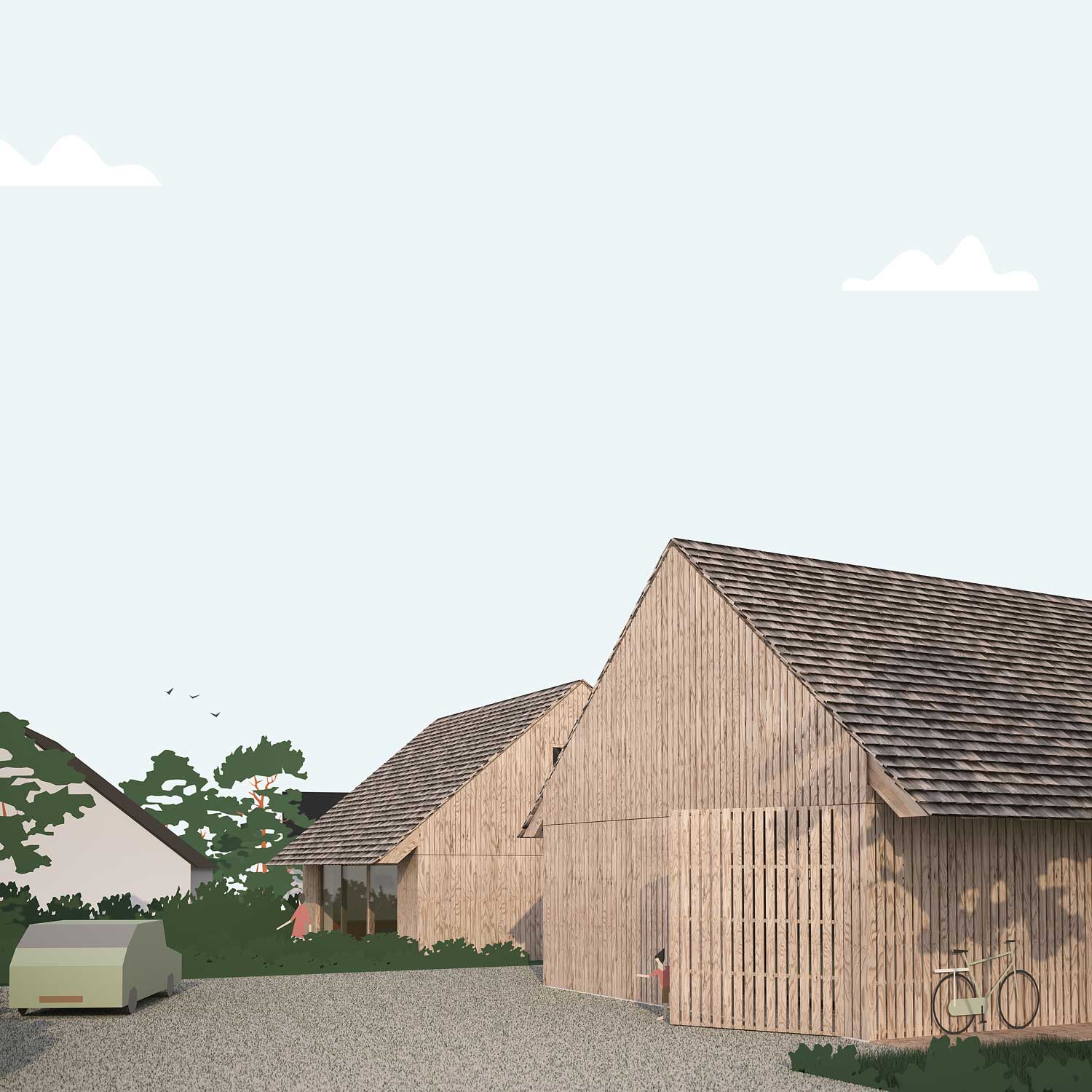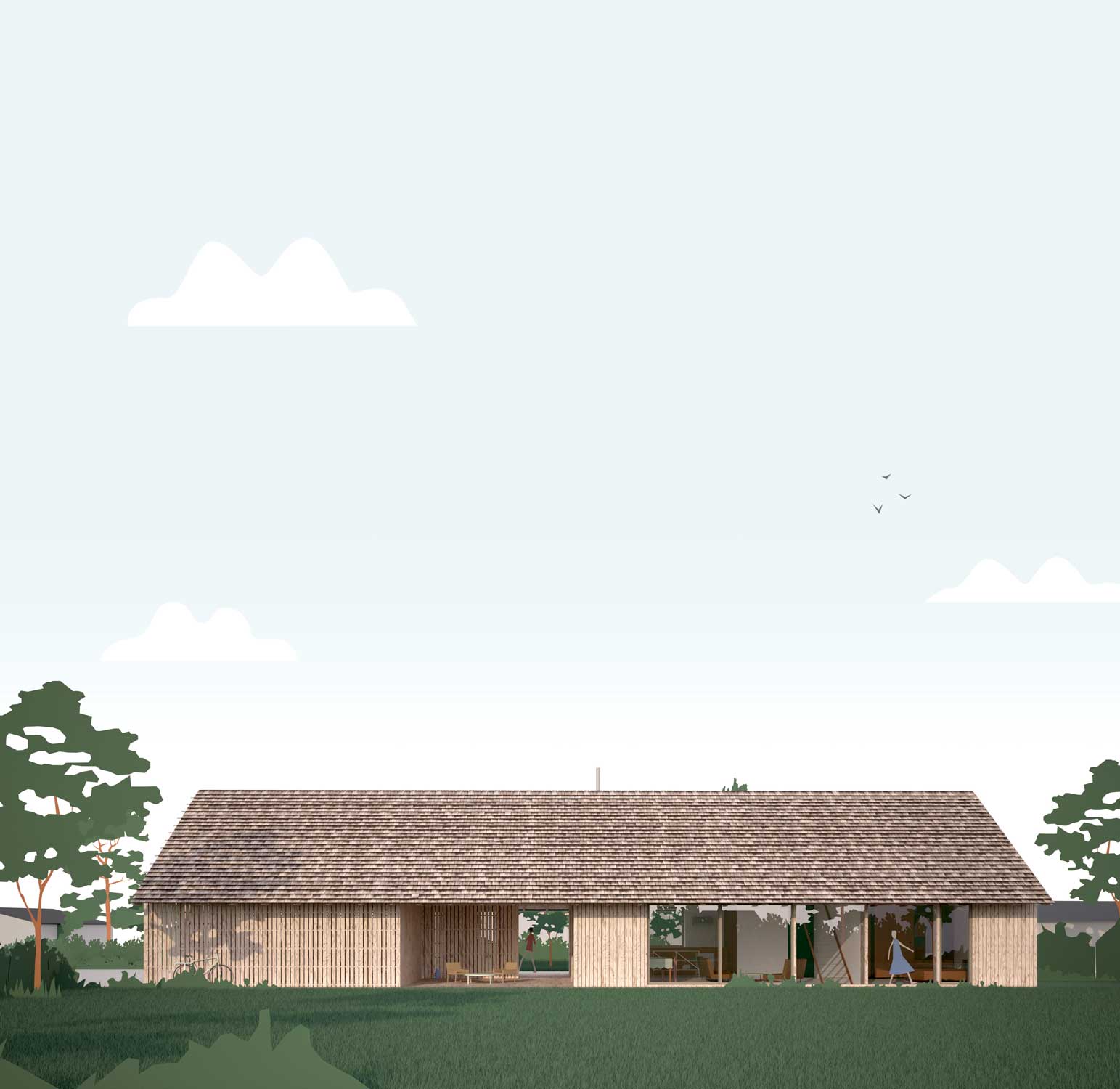 En plein cœur d’un îlot végétal dans un hameau près de Paimpol, le projet consiste en la construction d’une maison d’habitation et d’un studio. Le volume principal est orienté Nord-Sud afin de maximiser les apports solaires dans les pièces de vie. La maison, le préau et le garage, prennent place sous une grande toiture à deux pans, aux débords suffisants pour éviter les surchauffes d’été. Le studio est implanté avec un éloignement restreint entre les deux constructions afin de maintenir le lien d’usage. En arrière du volume principal, il est tourné vers l’Ouest. L’implantation générale du projet s’inspire des constructions traditionnelles du secteur rural Paimpolais : une maison principale, accompagnée d’un ou plusieurs volumes annexes articulés autour d’une cour ou d’un potager. Conçu de manière globale entre espaces bâtis et espaces paysagers, ce projet porte une attention particulière au maintient des vues et de l’ensoleillement du voisinage. La construction sera réalisée en ossature bois et répondra aux critères passifs.